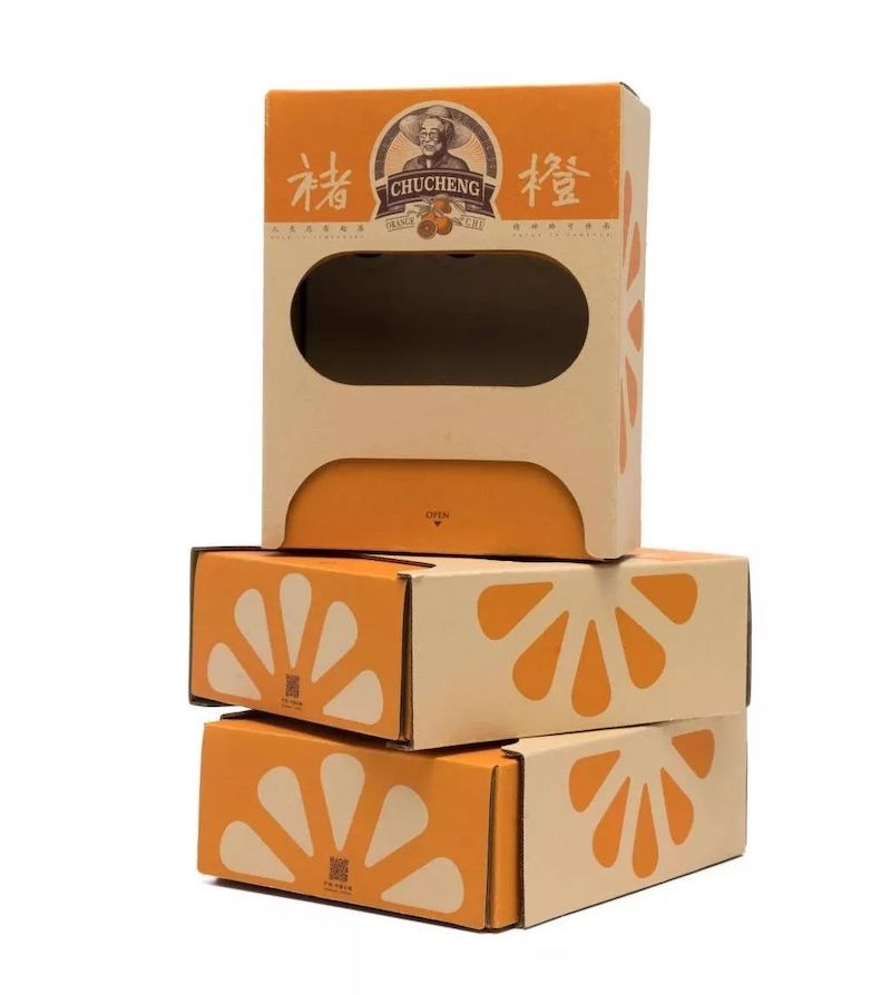 該作品在2016年獲得了德國(guó)紅點(diǎn)視覺(jué)設(shè)計(jì)大獎(jiǎng),以有份量的木刻版畫(huà)方式表達(dá)對(duì)褚時(shí)健老先生的尊敬。輕輕向外抽拉,橙子就會(huì)自動(dòng)升起。方便了橙子的取出和展示的功能,也暗示著老人一生的起起落落。