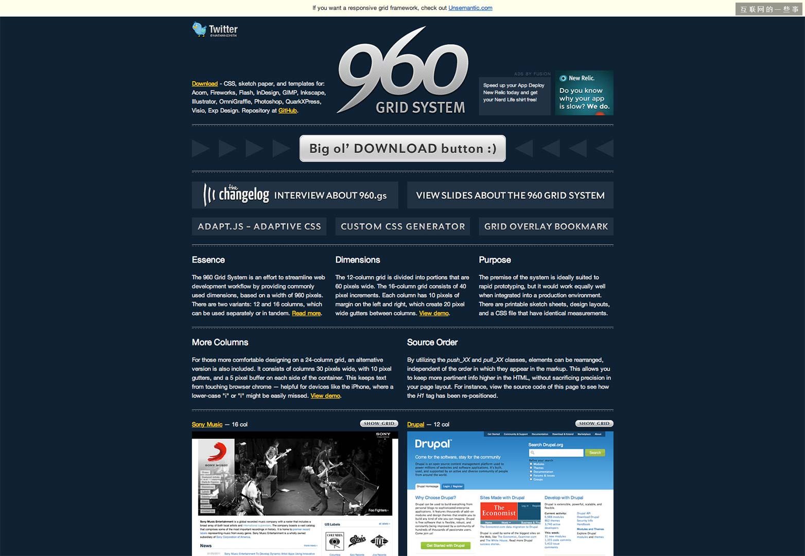 在網(wǎng)站設(shè)計中合理使用小色塊可以讓用戶更容易注意到頁面重要的部分。960 Grid System 網(wǎng)站就是實例。960柵格系統(tǒng)就是希望能簡化網(wǎng)站的開發(fā)流程,所以965 Grid System網(wǎng)站本身就靈活地使用柵格系統(tǒng)系統(tǒng),將不同的內(nèi)容分塊展示出來。黃色的“view demo”在深色底和白色文字為主的網(wǎng)站上非常明顯又不會喧賓奪主,左上角的Twitter圖標(biāo)則直接鏈接到網(wǎng)站主設(shè)計師Nathan Smith的Twitter上。