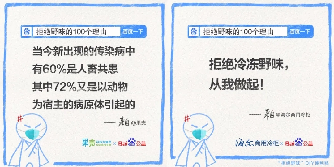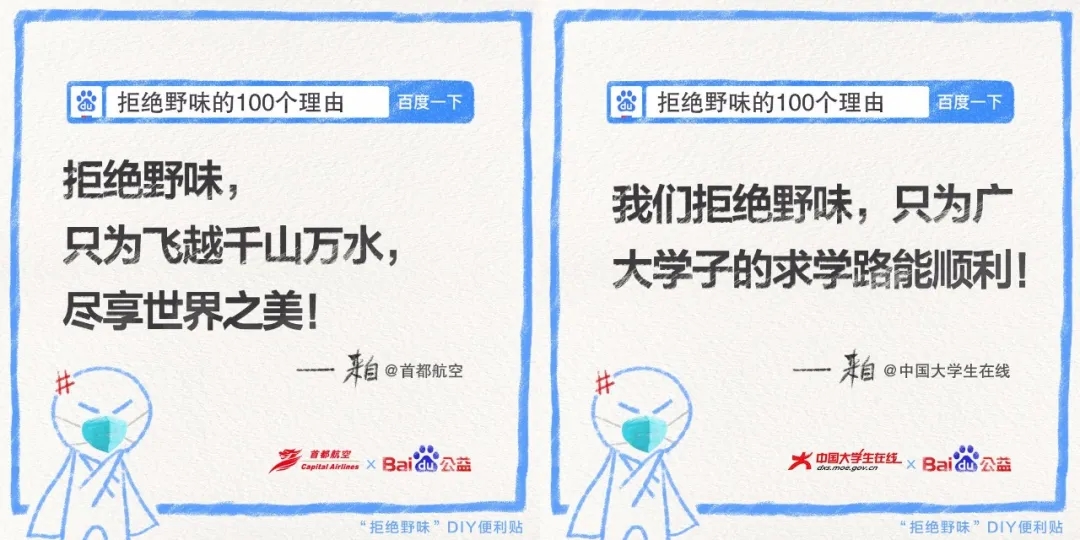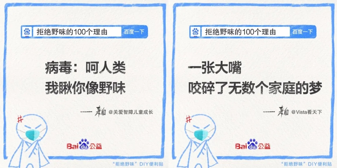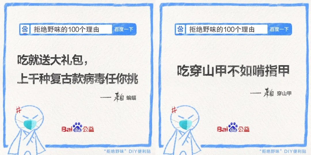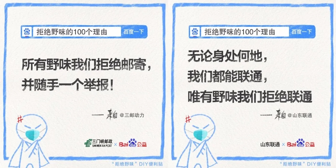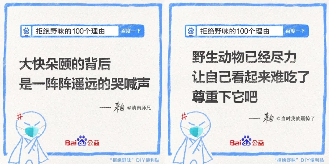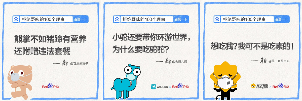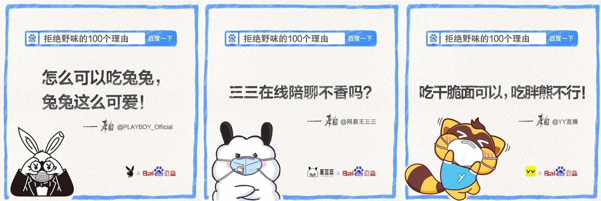同時(shí),發(fā)起方百度邀請不同行業(yè)領(lǐng)域的品牌和平臺、以及不同身份類型的群體和組織發(fā)聲,逐一撬動(dòng)多個(gè)圈層的關(guān)注度,統(tǒng)一傳遞出大大小小方方面面關(guān)于“拒絕野味”的明確態(tài)度: