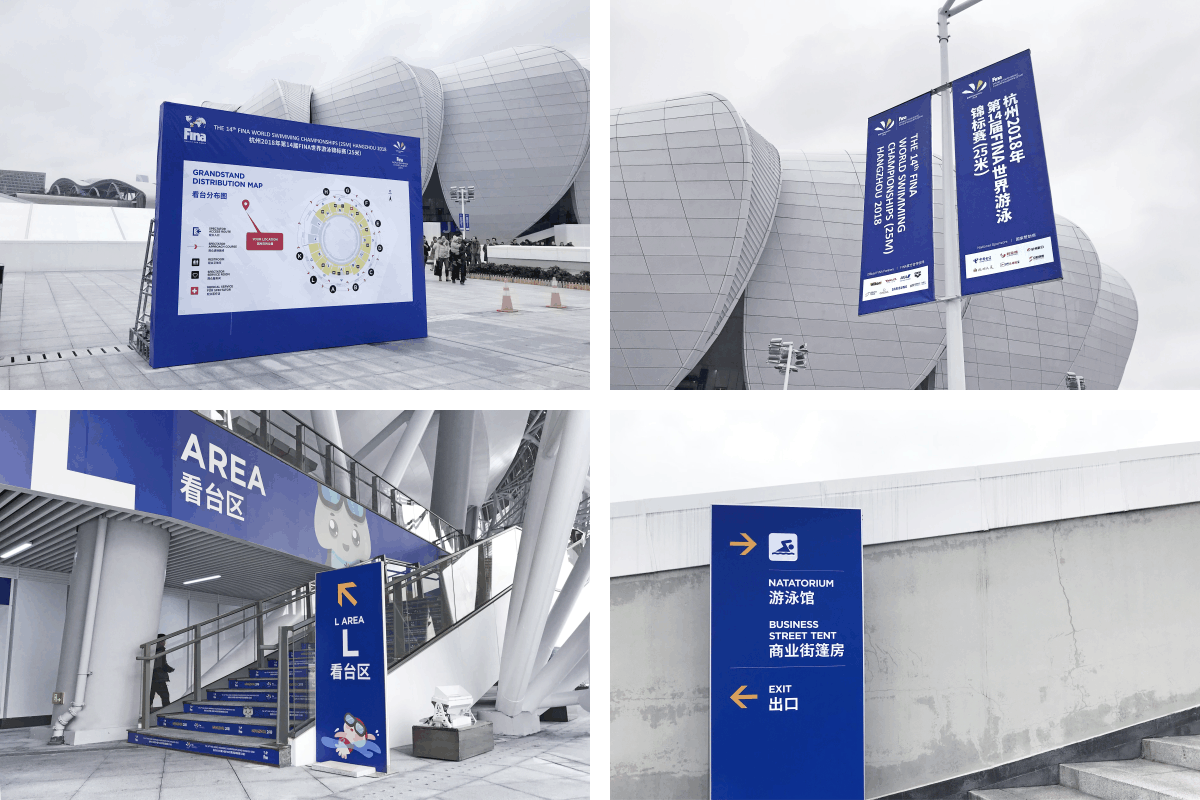 擇道觀行服務(wù)以賽事景觀組為中心,在確保國(guó)際游泳聯(lián)合會(huì)(FINA)以及世界游泳錦標(biāo)賽特有的體育文化及賽事視覺(jué)要求得到充分尊重的前提下,對(duì)競(jìng)賽區(qū)(奧體中心網(wǎng)球館)、非競(jìng)賽區(qū)(機(jī)場(chǎng)、車(chē)站、中轉(zhuǎn)中心及賽事合作酒店10余家)以及訓(xùn)練場(chǎng)館(浙江省體育職業(yè)技術(shù)學(xué)院)進(jìn)行統(tǒng)一的體育形象景觀策劃、設(shè)計(jì)及落地實(shí)施。